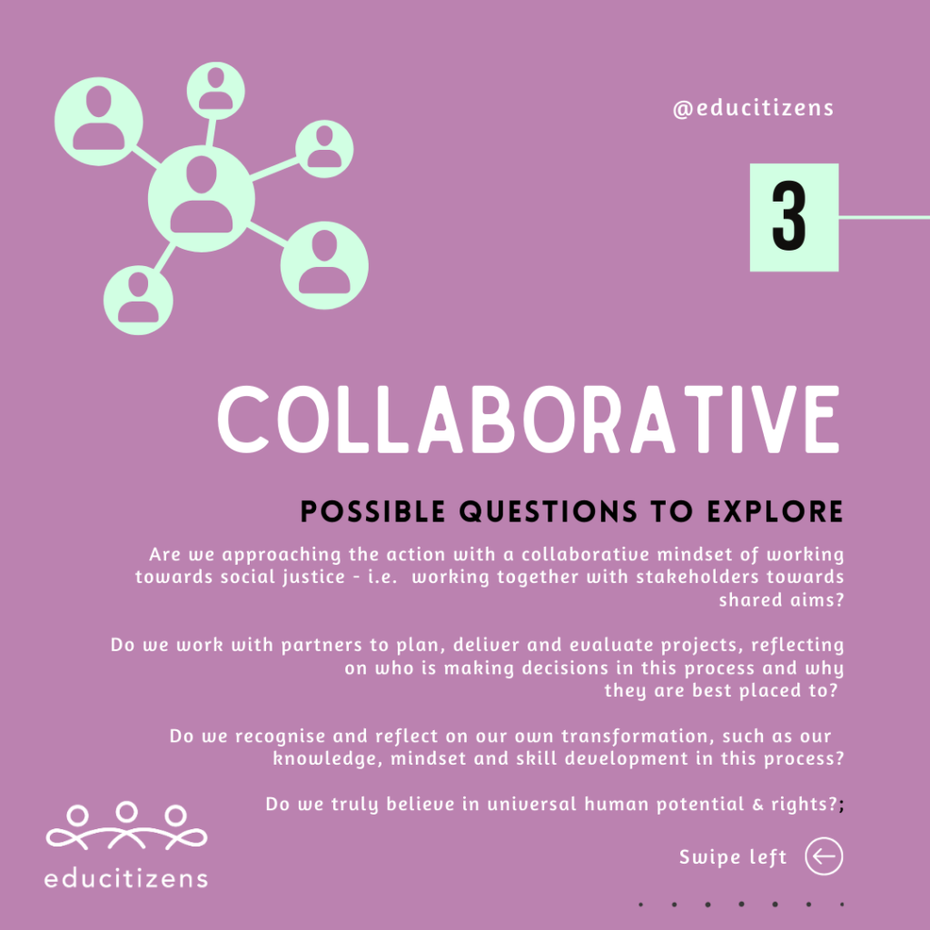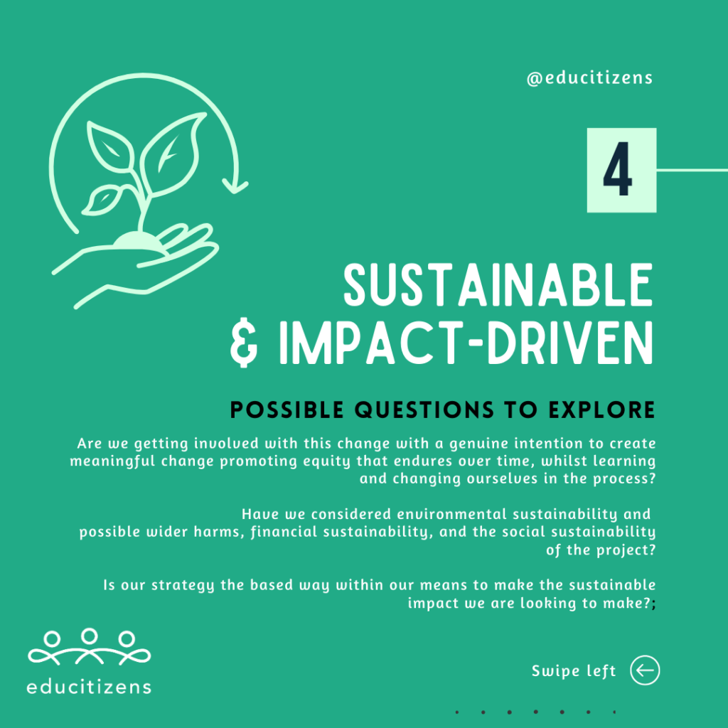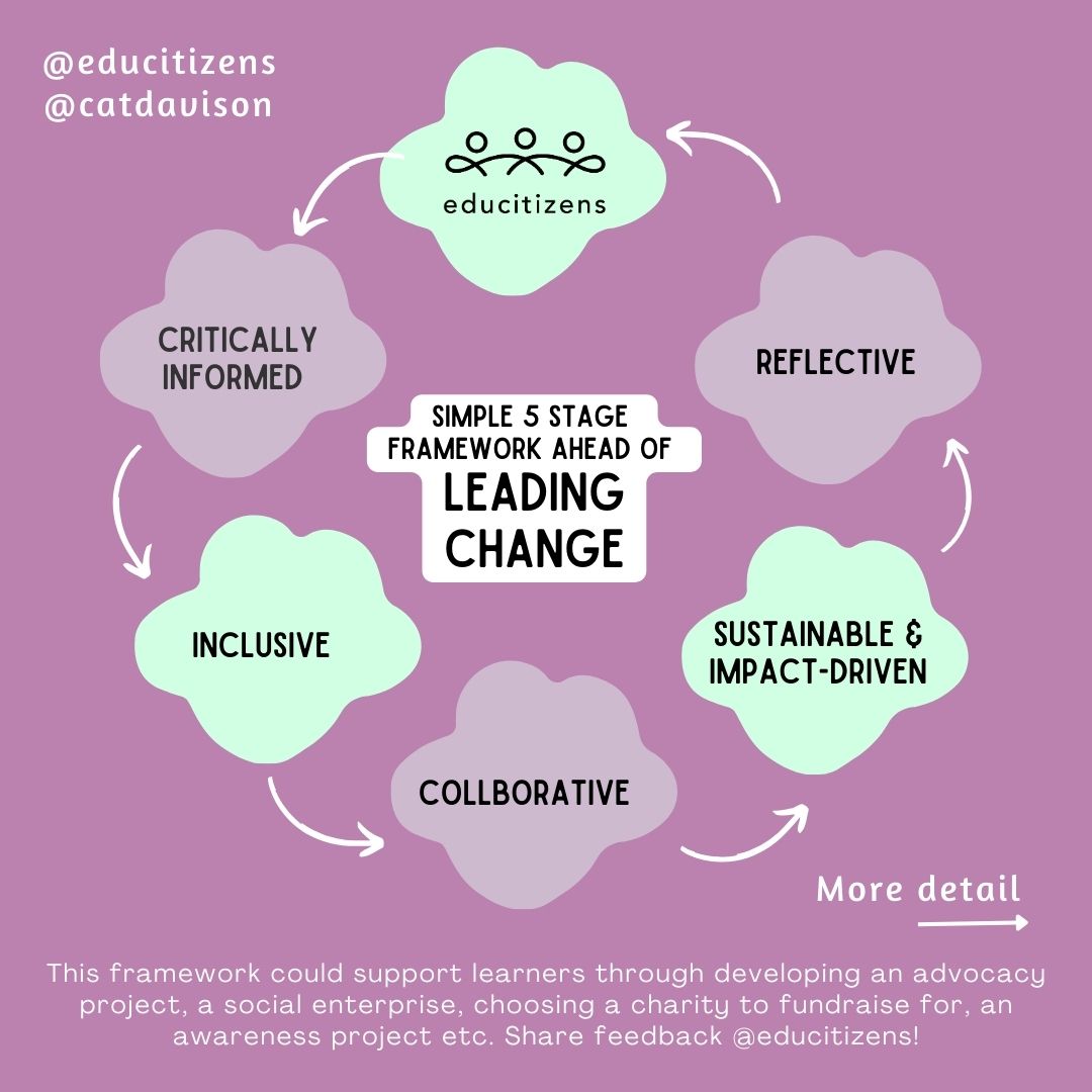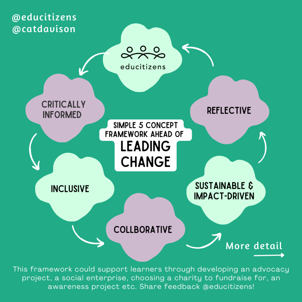 When working in a school context in this area, and working more widely with learners in the field of social leadership, I realised that a framework was a helpful basis to move conversations through when students (or staff) might be heading in a direction that might not lead to their own (or our collective) intended impact.