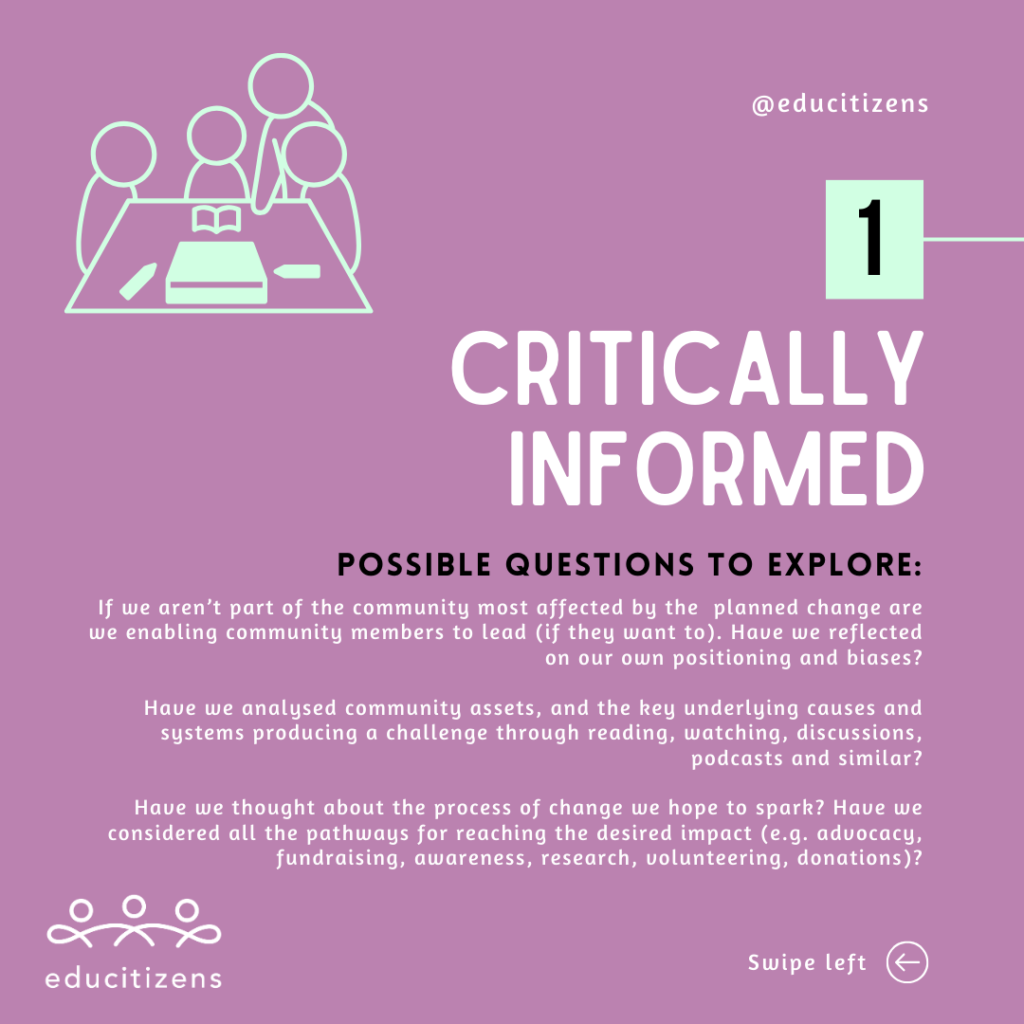 Here’s my attempt at a simple #educitizens five step framework for guiding learners (and all of us!) through specific social and environmental change projects. A more creative version of this will come one day!